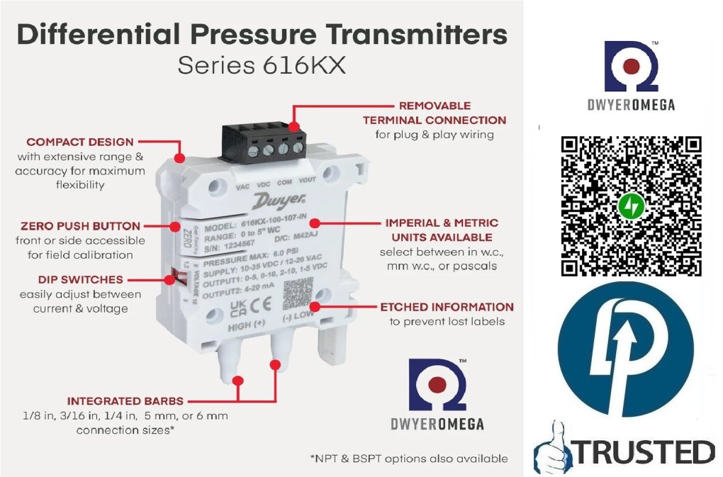 The 616KX Series Differential Pressure Transmitters Offer Installers and Maintenance Professional’s Maximum Flexibility in Pressure Ranges within a compact design. As Dwyer’s smallest differential pressure transmitter,it ensures Simplicity With an Edge-Mounted Push-Button Zero For Easy access in any mounting configuration and features field-selectable output signals.The molded housing supports three sizes of both imperial and metric process connections, with optional 1/8″ NPT or BSPT Threaded models, ensuring easy and flexible process connections.