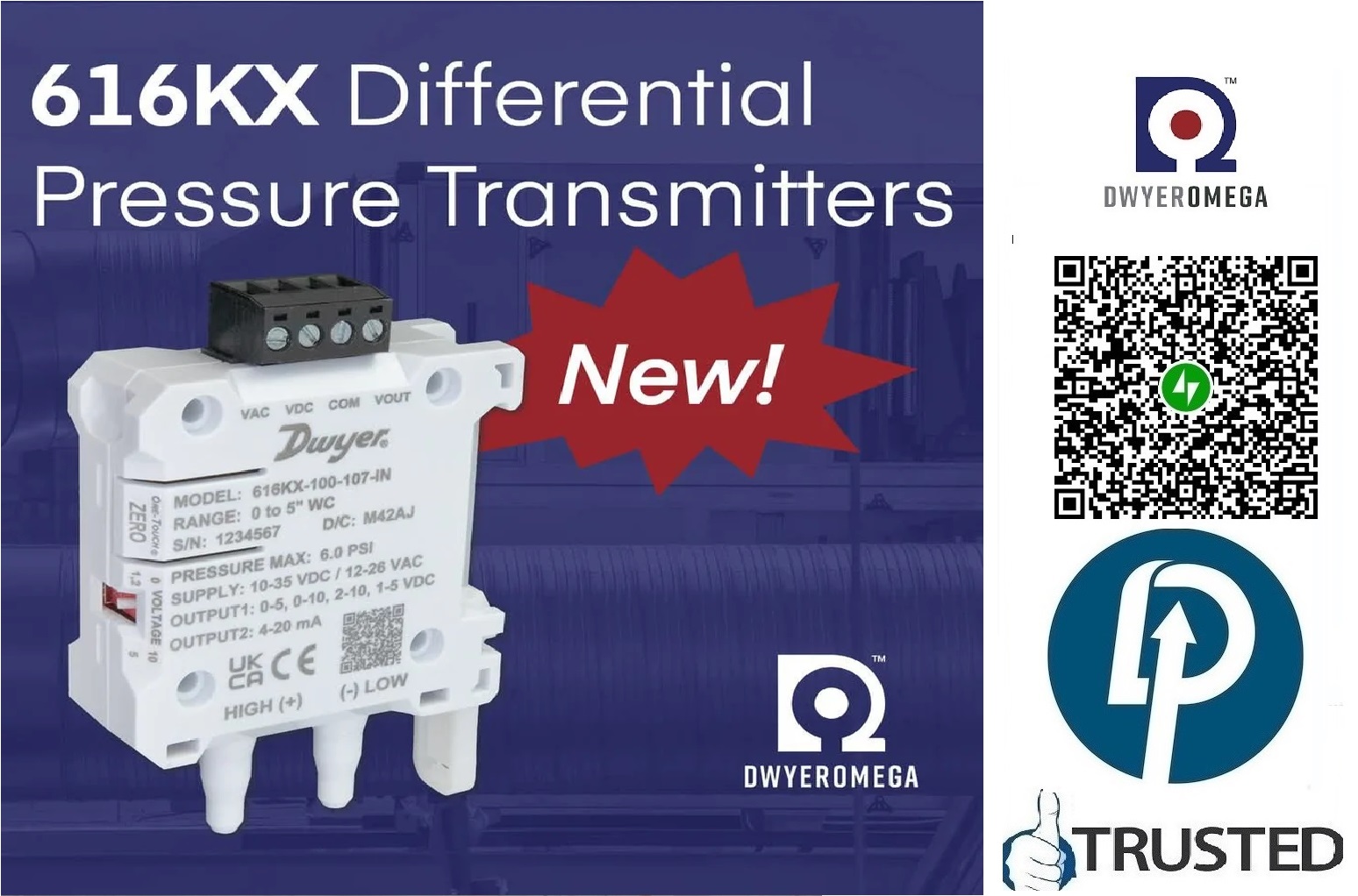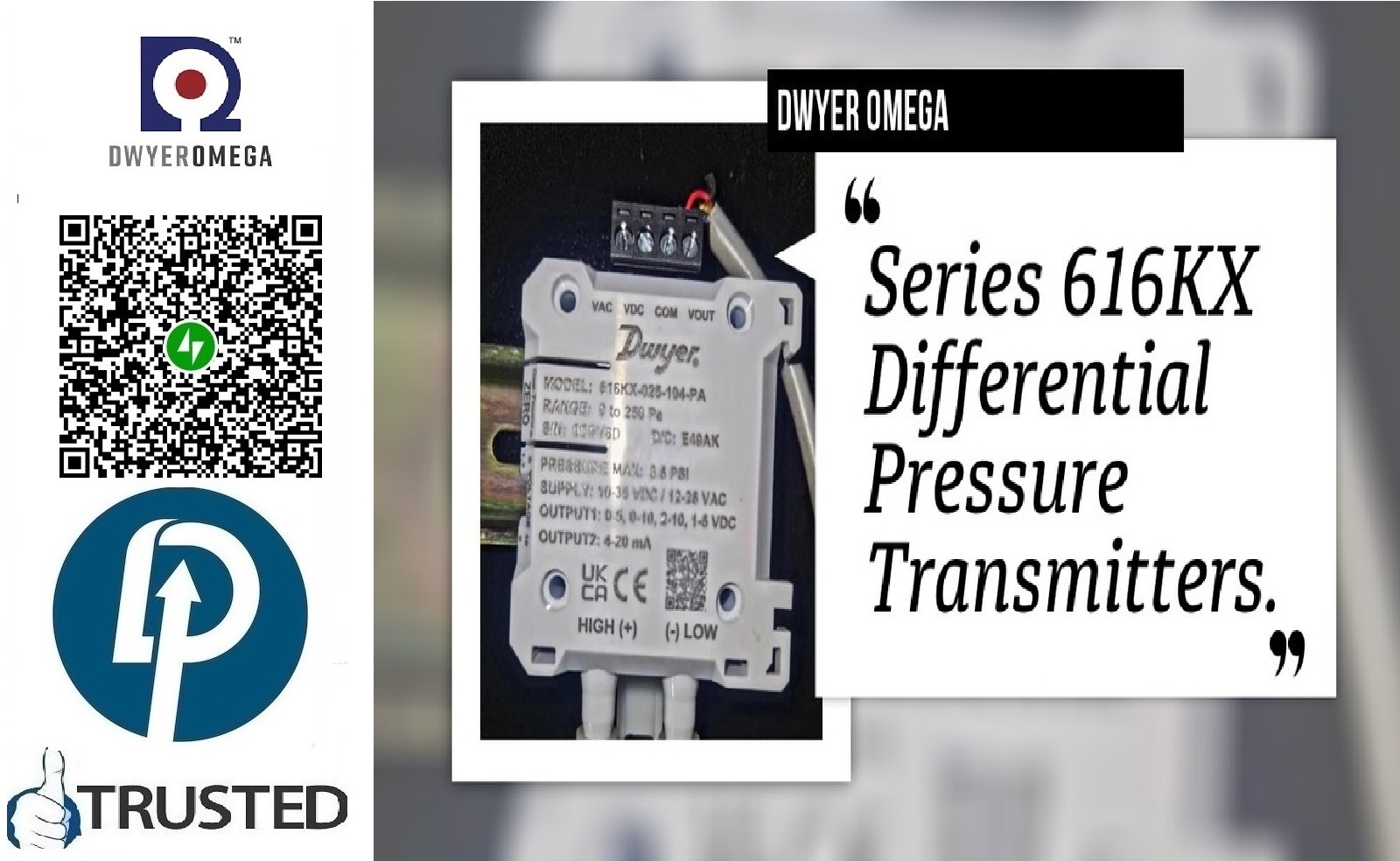 - Item Code: DWYER Pressure Transmitter MODEL > 616KX-025-104-PA > Range 0 to 250 Pascal